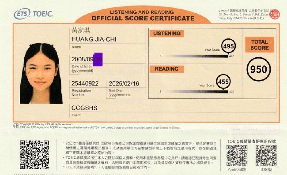 我真的非常開心! 2012年7月,開始陪2個孩子學成寒教材, 持續不間斷, 差6歲的2個孩子, 分別在高一都達到我設定的950分。 為什麼我只設定950分?原因1. 最初是哥哥選的一些特殊選材的學校, 英文系設定的英文門檻。妹妹就比照哥哥的多益成績去要求, 但妹妹不想讀英文或外文系, 故多益950分就很夠用了。原因2.我家2個孩子讀書能力不是很精熟型的,不用一直鑽研到990分, 他們兄妹倆的能力在同齡間更顯著的是善溝通,能交際, 有領導力, 外向, 他們就把精力拿去用在對他們更有利的方向去精進, 把時間花在參加大型活動和競賽上,效益更大!